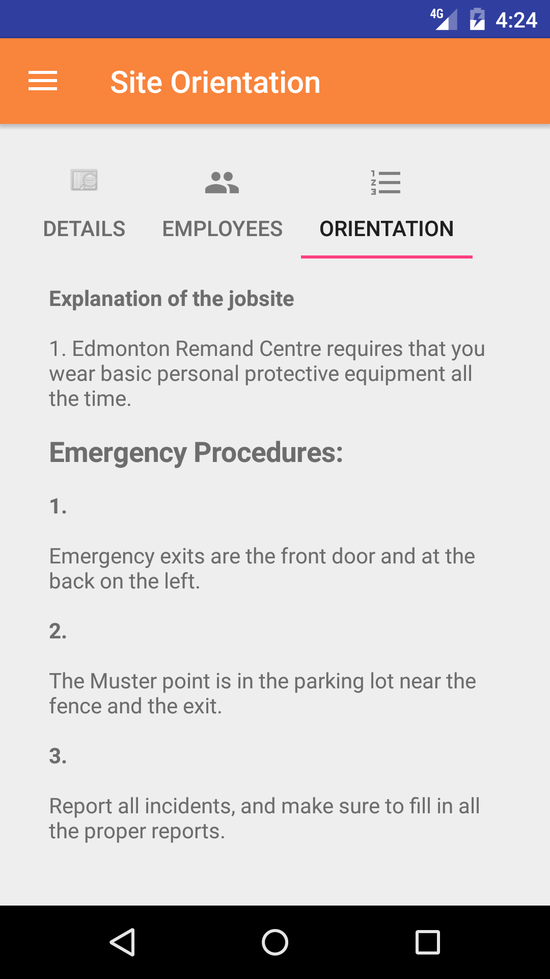 Since each job site is different, safetynet allows a field staff to setup a specific orientation for each job site. Each Site Orientation for a job site