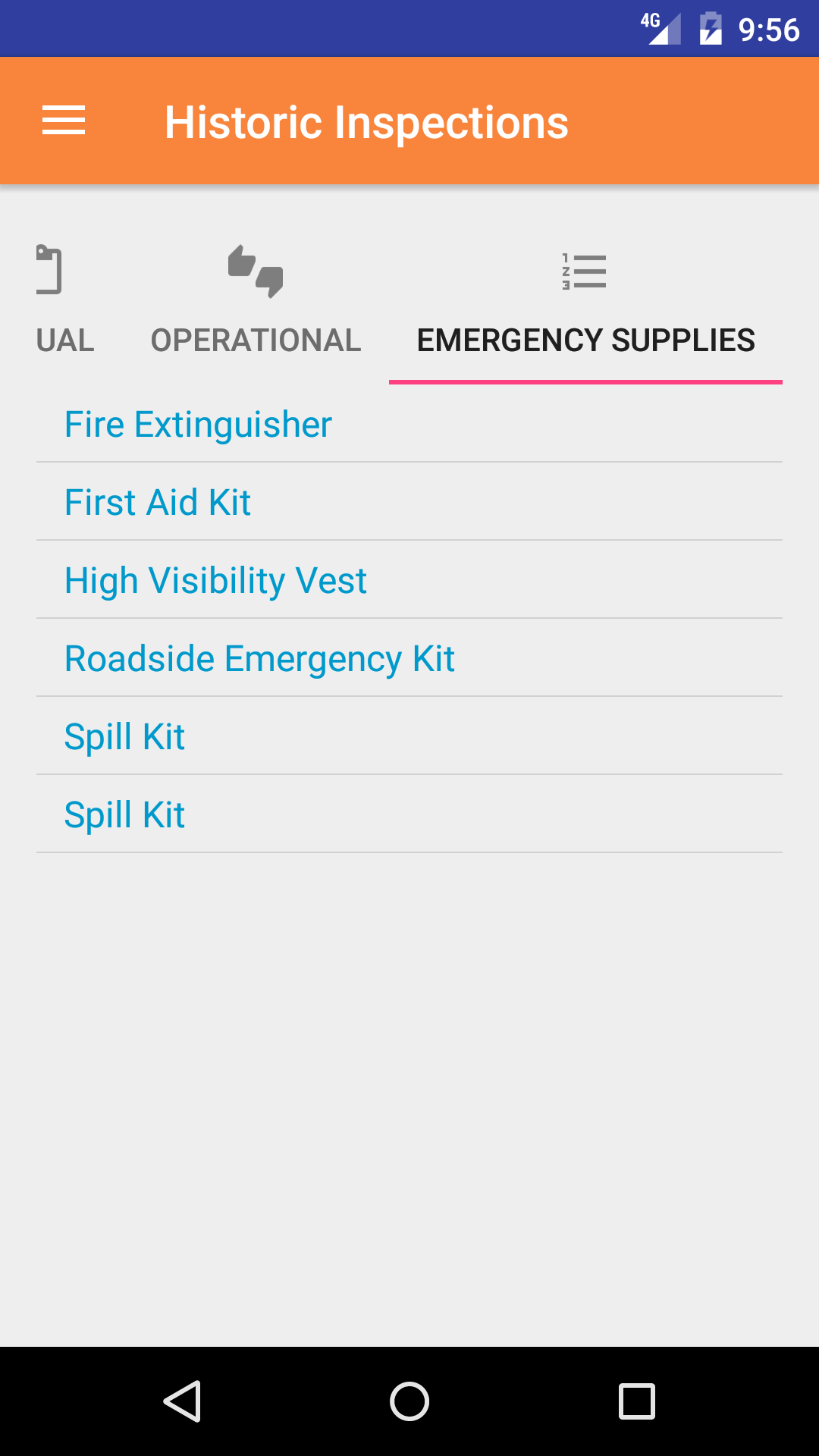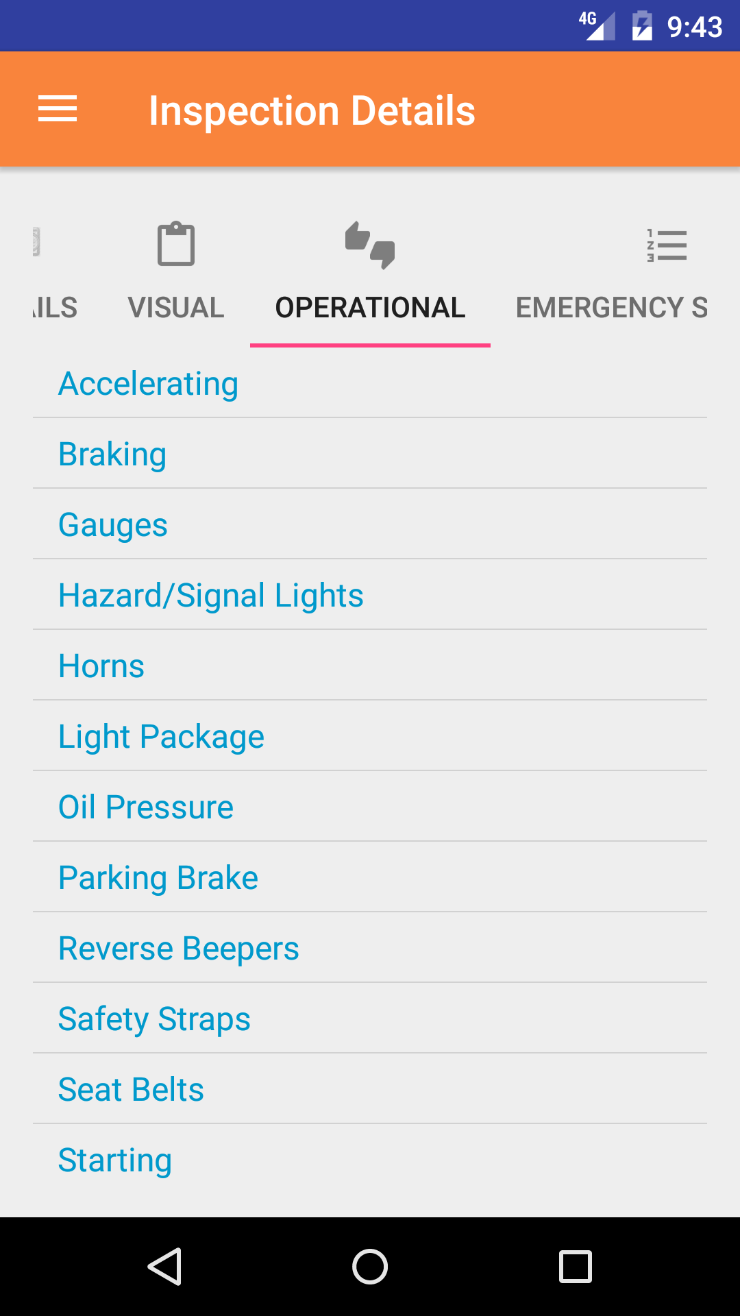 - Tap the Operational icon at the top of the screen to open the Operational Inspection Checklist screen. The screen loads
