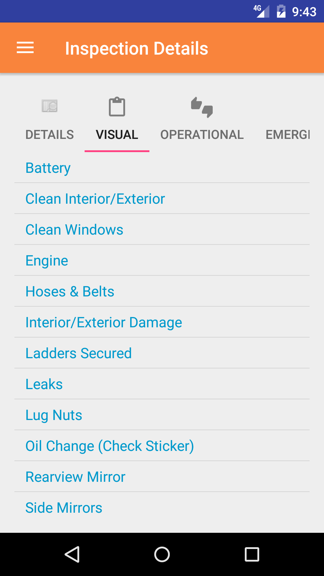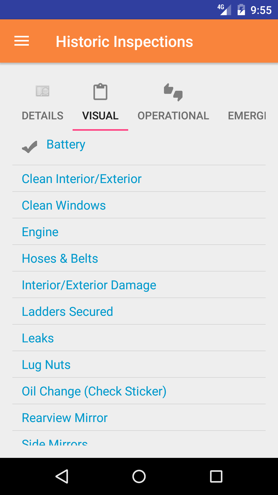 - Tap the second tab on the menu, the Vehicle Inspection view.