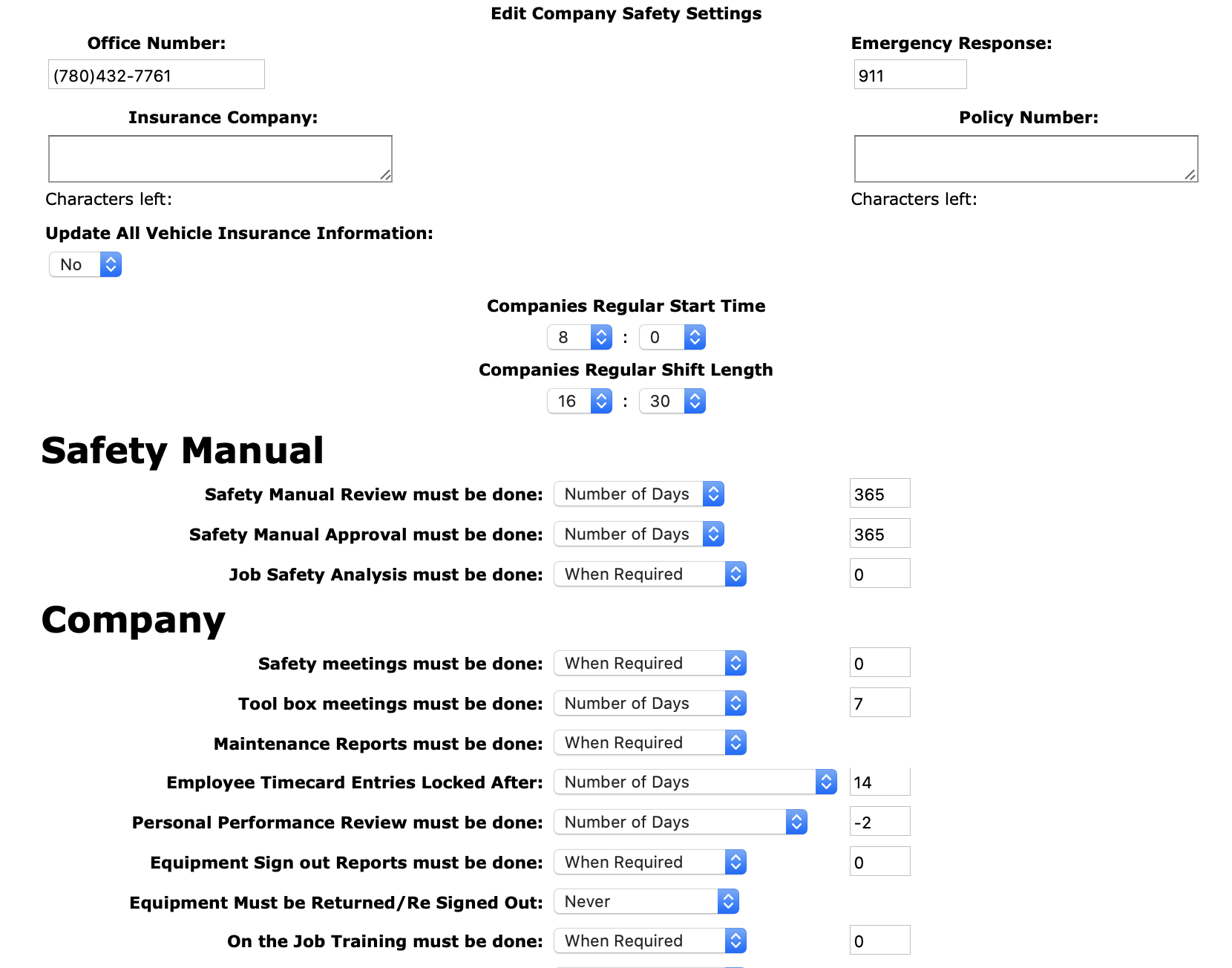 Safety Manual Review must be done:Choose how often a safety manual reviews should be done. From the select box and either choose monthly, yearly, number of days or when required from the select box. If number of days is chosen a number value must be entered.
