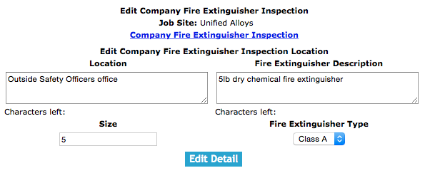 Since each job site is different, safetynet allows a field staff to setup a specific company fire extinguisher inspection for each job site. Each Company Fire Extinguisher Inspection for a job site is set