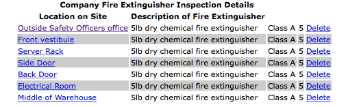 The company fire extinguisher inspections for a job site is simply the repository of locations of fire extinguishers and what types and sizes of fire extinguishers are found at these locations on site. One of