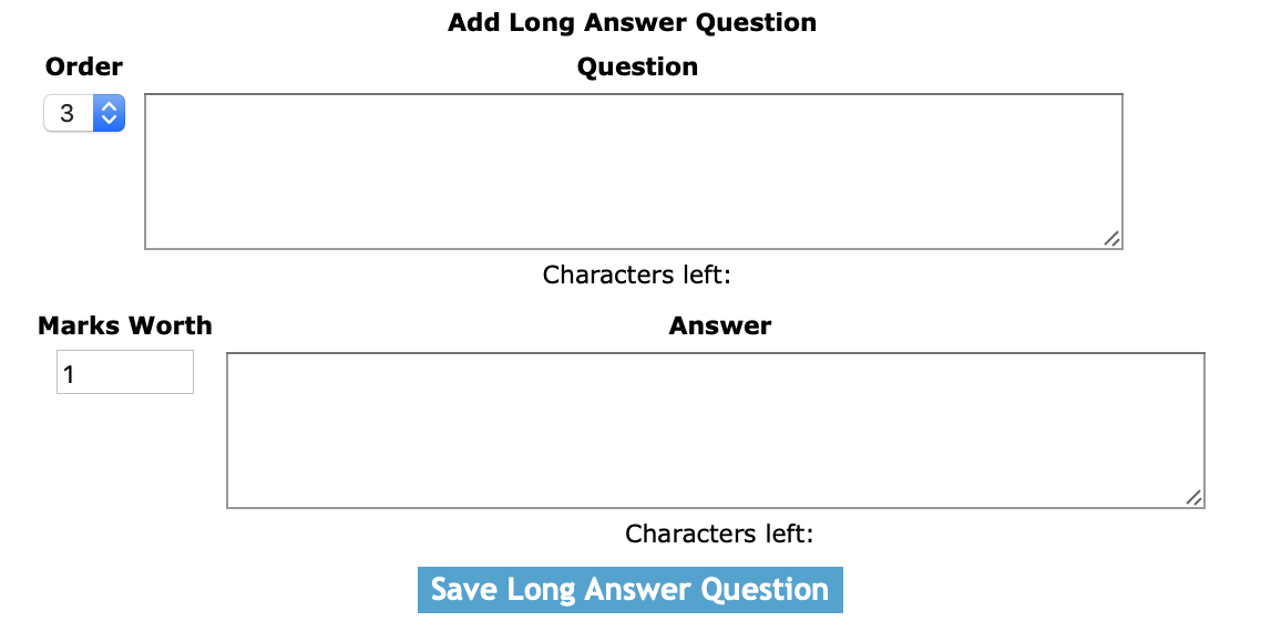 Question: The question field allows users enter a question to the for a long answer question. The character limit of this field is 500.