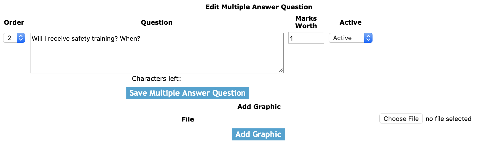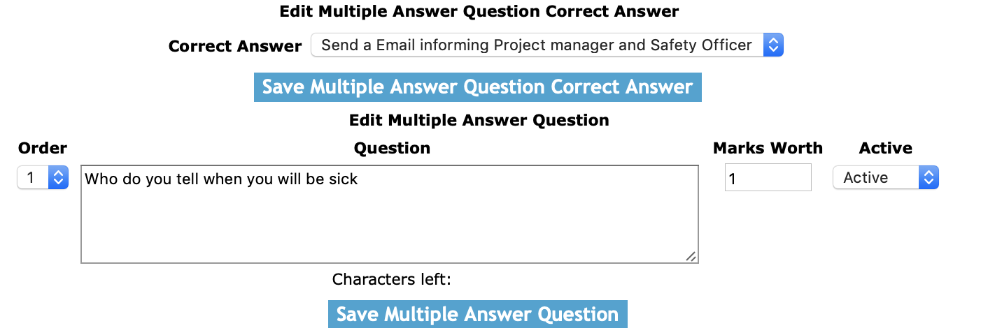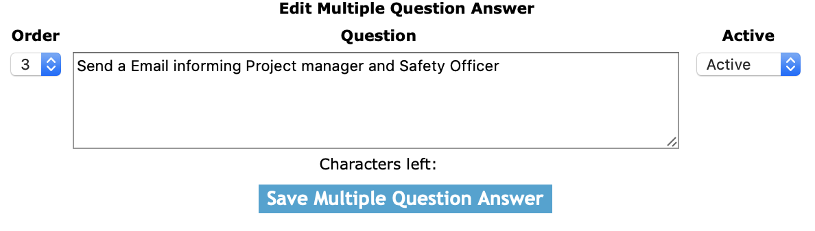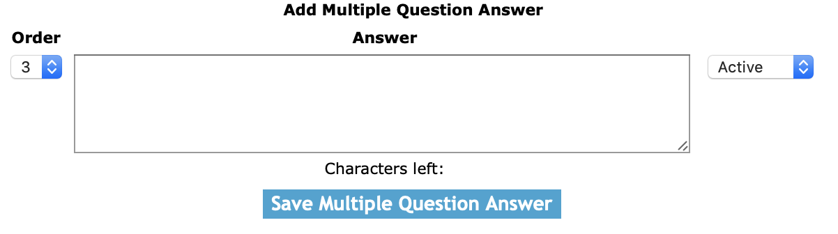 Answer: The answer field allows users enter a answer to the for a multiple question answer. The character limit of this field is 500.