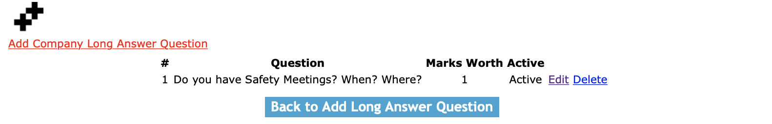 To delete a Company Long Answer Question, click on the delete link of the company long answer question that you would like to delete.