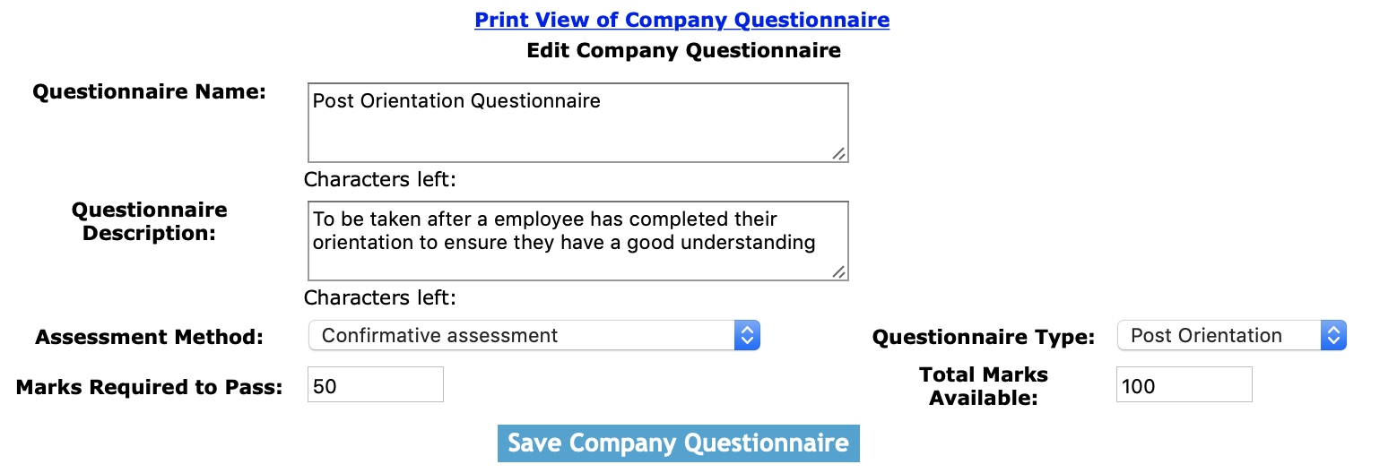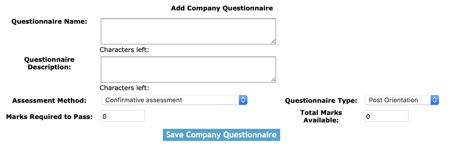Click the 'Add Company Questionnaire' button to create a questionnaire. The edit company questionnaire screen will load. From here, proceed to edit as per the instructions below.