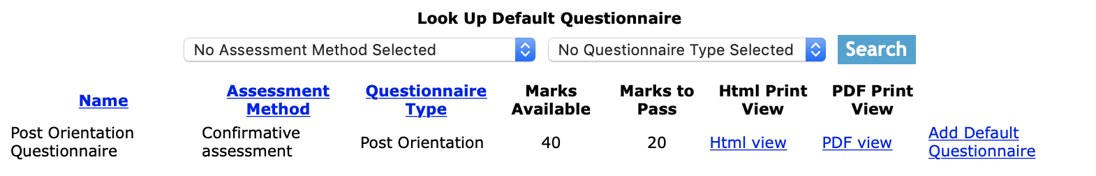 All search results can also be sorted by clicking on the results headings name, assessment method, and questionnaire type. Clicking on the same heading can do switching the results order from ascending to descending.