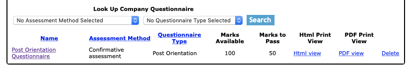 To delete a Company Questionnaire, click on the delete link of the company questionnaire that you would like to delete.