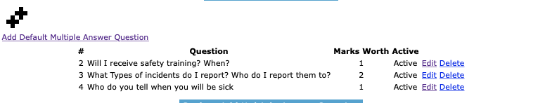 Active: Allows a user to select the active status. Only multiple answer question set to active will be viewable to be added to company questionnaire.
