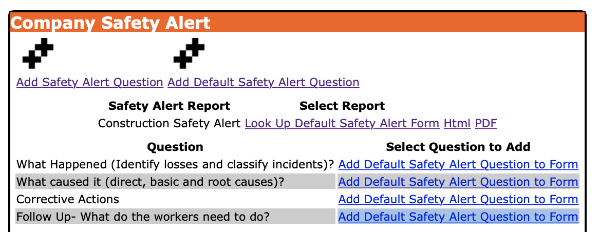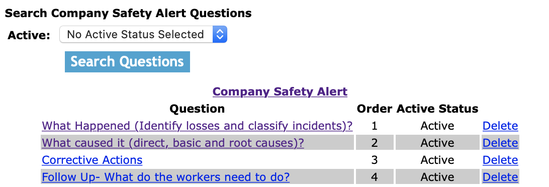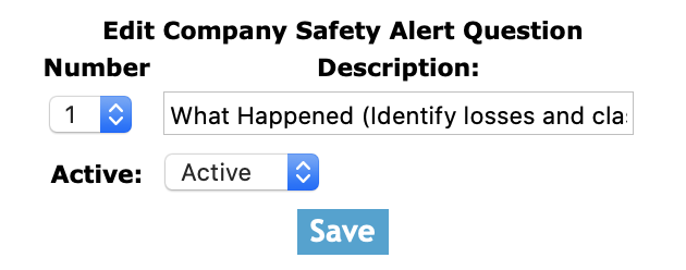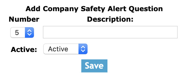 The company safety alert section allows companies to manage the questions, that will appear on safety alerts when created by your company. Users can create the basis of what will be used by field staff for future safety alerts