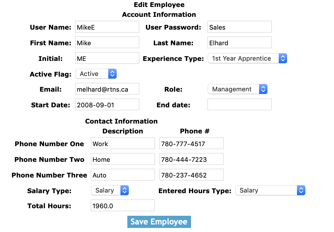 User Name: Enter the employee's user name. The character limit of this field is 15.