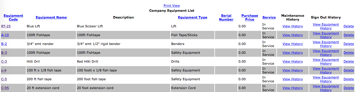 Company equipment can be signed out to work orders or company vehicles. Equipment signed out to vehicle can be signed out or assigned to that vehicle.
