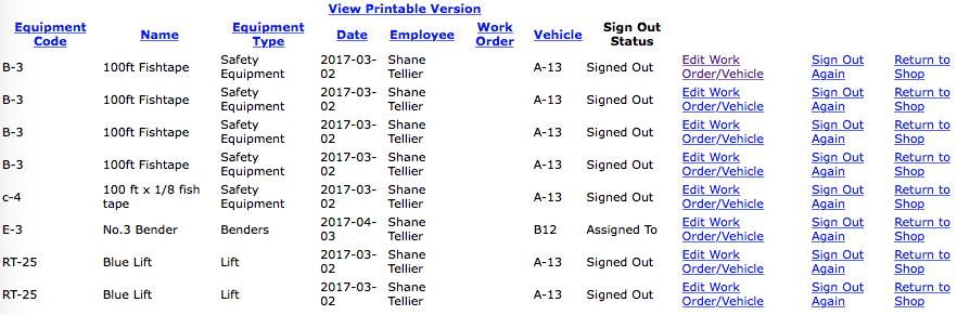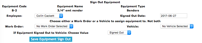 The equipment sign out section allows clients to sign out and track the equipment being assign to vehicles and work orders of their company.