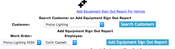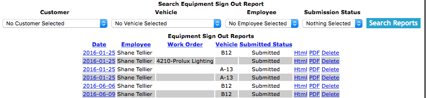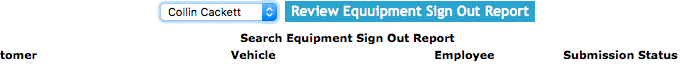 Equipment sign out reports can be searched by a combination of customer,vehicle and employee and submission status. Users can narrow search results by choosing any combination of the two search criteria.