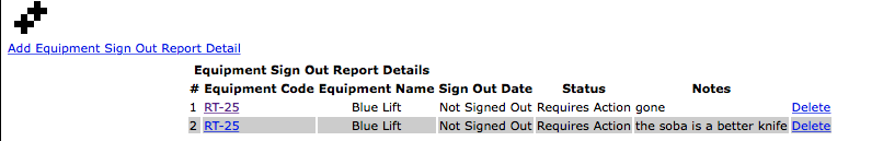 To delete a equipment sign out reports click the 'Delete' link of the equipment sign out report you want to delete.