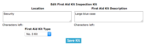 First Aid Kit Inspection Kit Description: Allows the user to input specific information about the first aid kit such as first