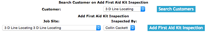 Click the “Search Jobsites” button. The Job Site select box on the Add First Aid Kit Inspection section will load with only the job sites of the selected customer.