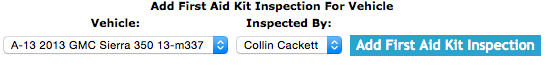 Vehicle: By selecting a vehicle from the select box, which loads with a vehicle code and then the license plate number users can choose which vehicle they want to create a first aid kit inspection for.