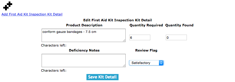 Review Flag: Allows the user to select the condition of the first aid kit detail. The default setting is Satisfactory.