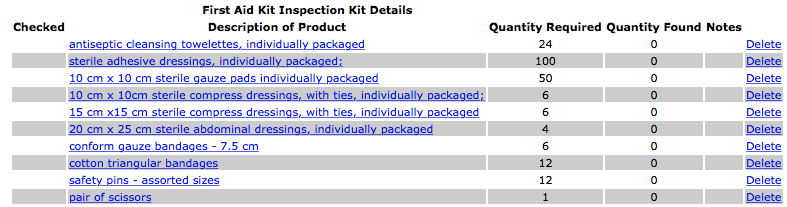 To delete a first aid kit inspections click the 'Delete' link of the first aid kit inspection you want to delete.