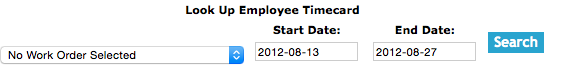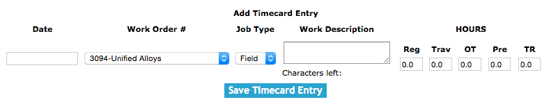 The Timecard section allows field staff to enter their hours worked on specific work orders, with a description of the work completed and