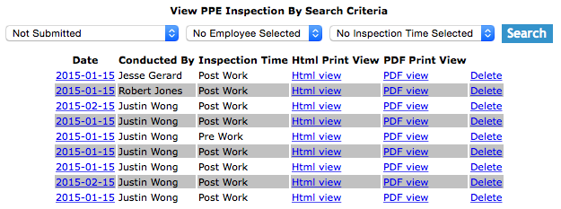 The personal protective equipment inspections section allows a user to create and record a personal protective equipment inspection. Personal Protective Equipment Inspections can be create from a company personal protective equipment inspection.