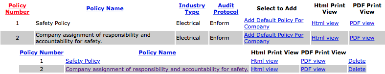 On the next screen the Default Safety Manual Policies will load, with a listing policy number, policy name, industry type and audit protocol, clicking the 'Add Default Policy For Company' link for a company