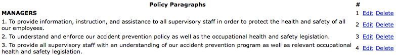for the policy. To delete the paragraph, click on the 'Delete' link to the right of the policy paragraph.