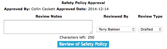 Review Notes: Enter review notes. Review notes in the case of management approval can be any notes management wants to leave about their approval of the safety policy. The character limit of this field is 250.