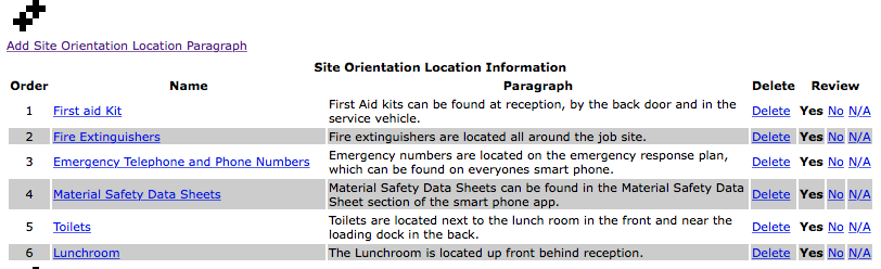 Since each job site is different, safetynet allows a field staff to setup a specific orientation for each job site. Each Site Orientation for a job site