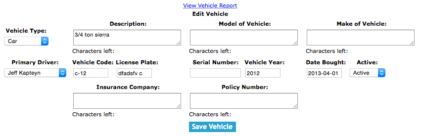 plate and vehicle code are going to be used to select the right vehicle when creating reports. The character limit of this field is 75.