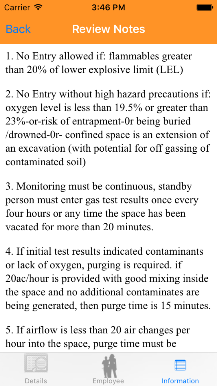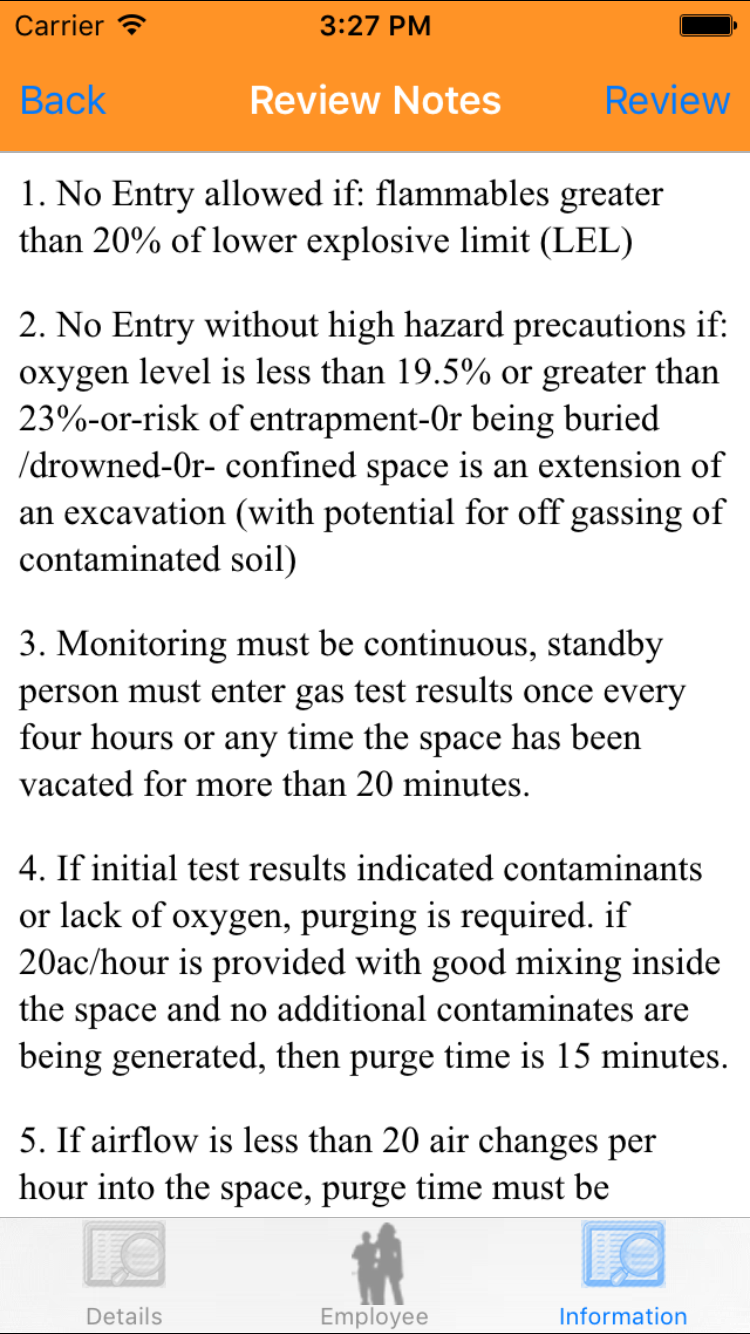 Companies create their own confined space review notes, which staff must review every time they perform a confined space entry. The notes will load on this view
