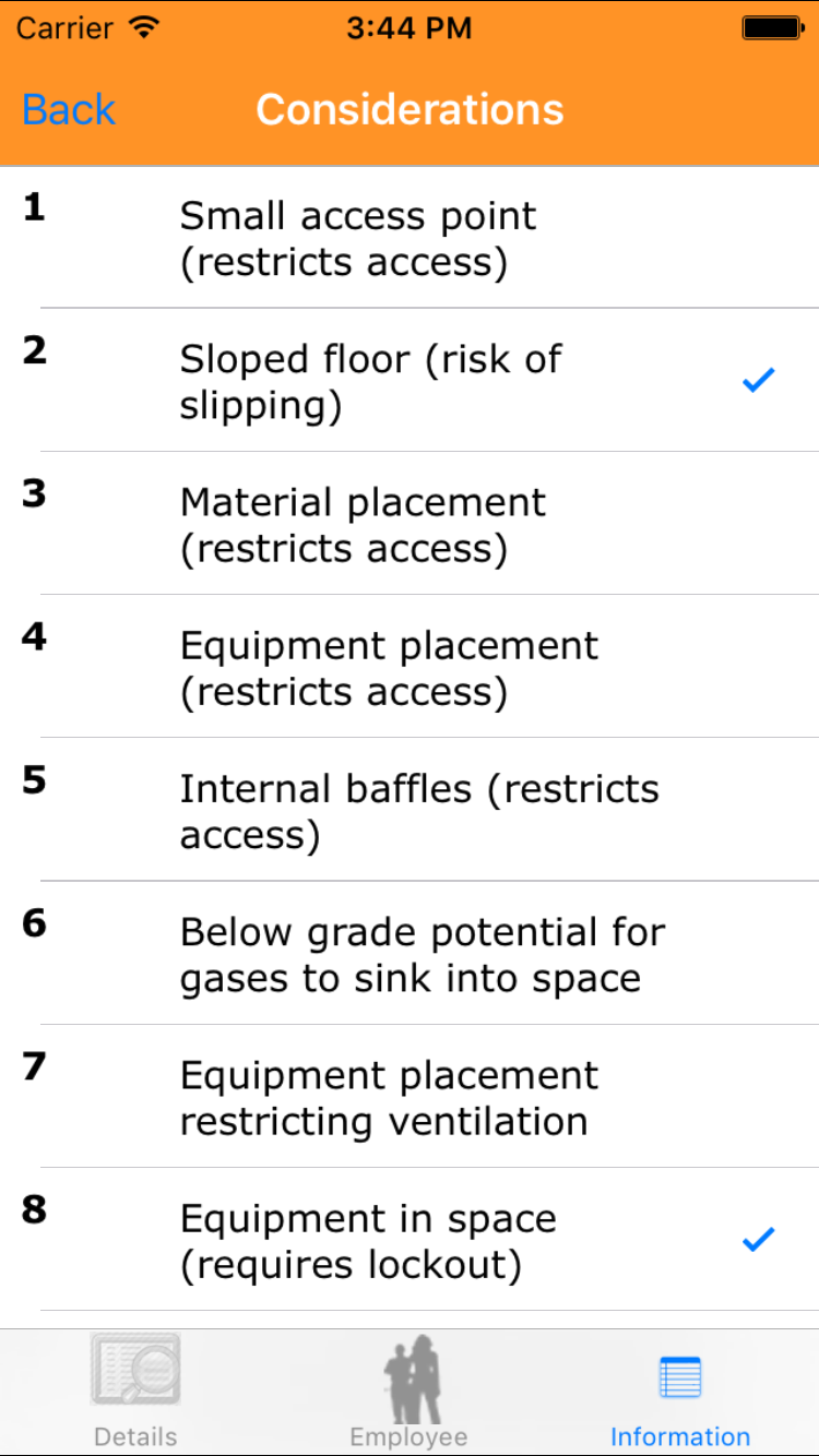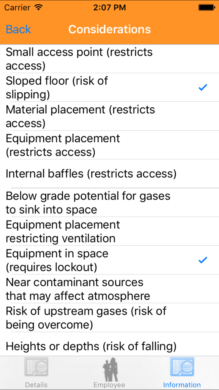 - Tap the Considerations button to load the list of considerations that should be considered during the entry to the confined space.