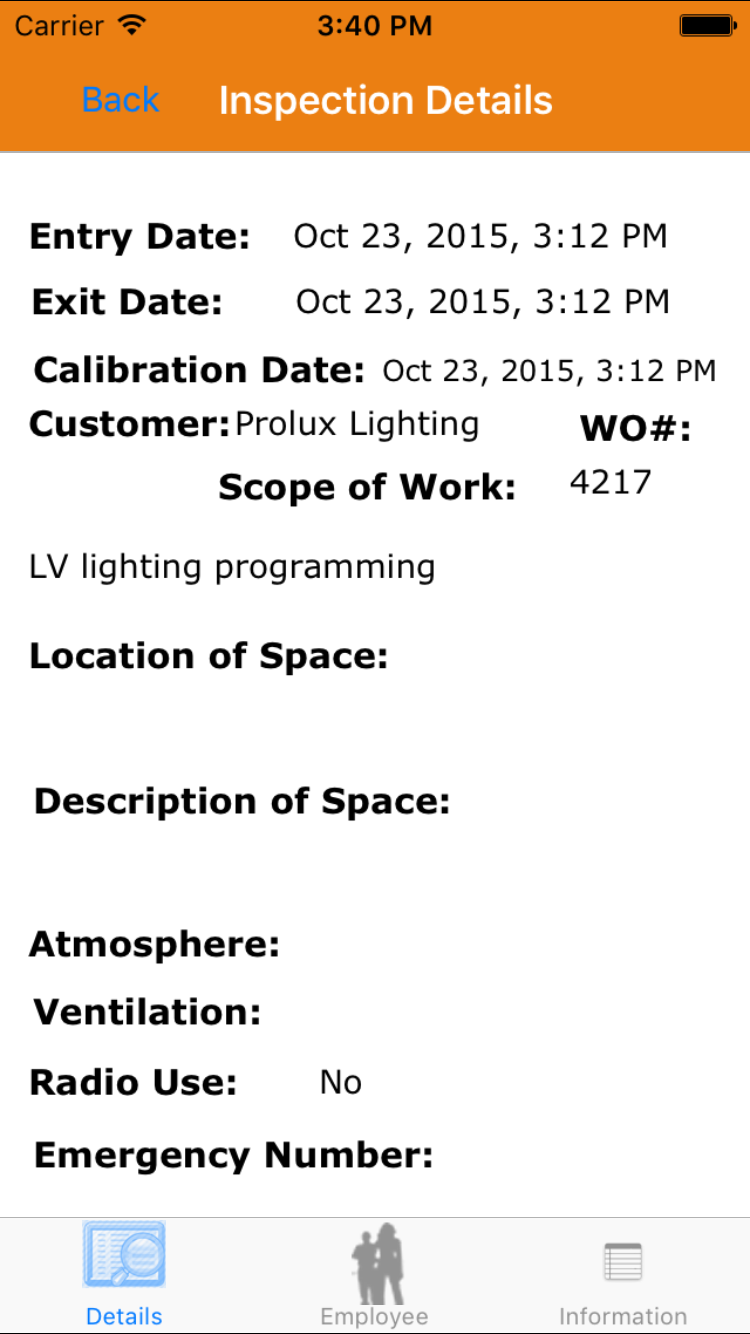 It loads the following details including entry date/time, exit date/time, work order number, scope of work, location of space, description of space, etc.