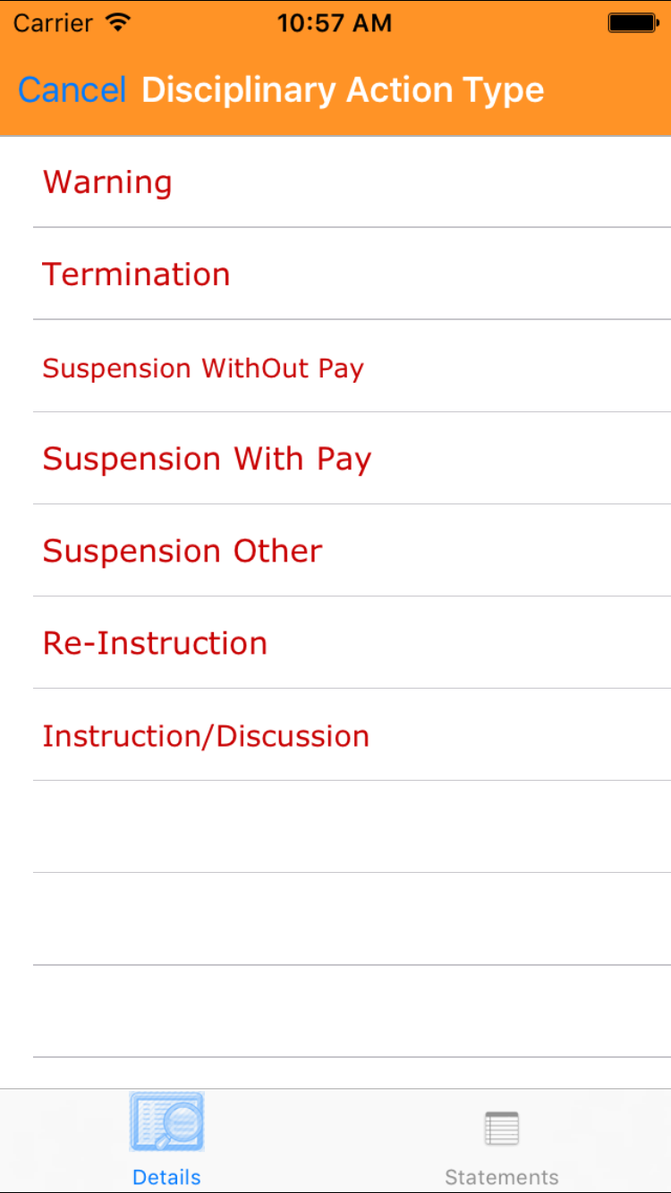 - Tap the Disciplinary Action field to open the Choose Disciplinary Action screen.