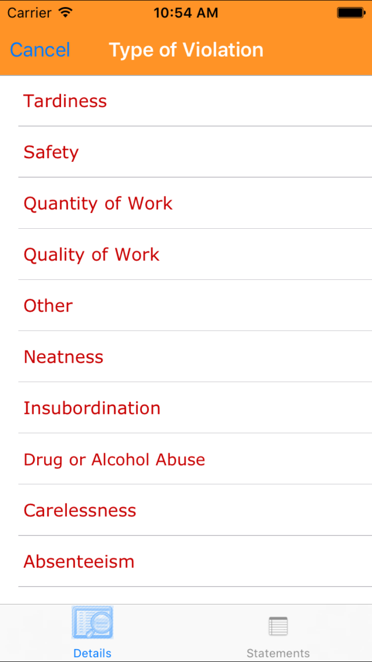- Tap the desired violation type to select it or tap Back in the top left corner to leave the Violation Type field unchanged and return to the Edit Disciplinary Report screen.