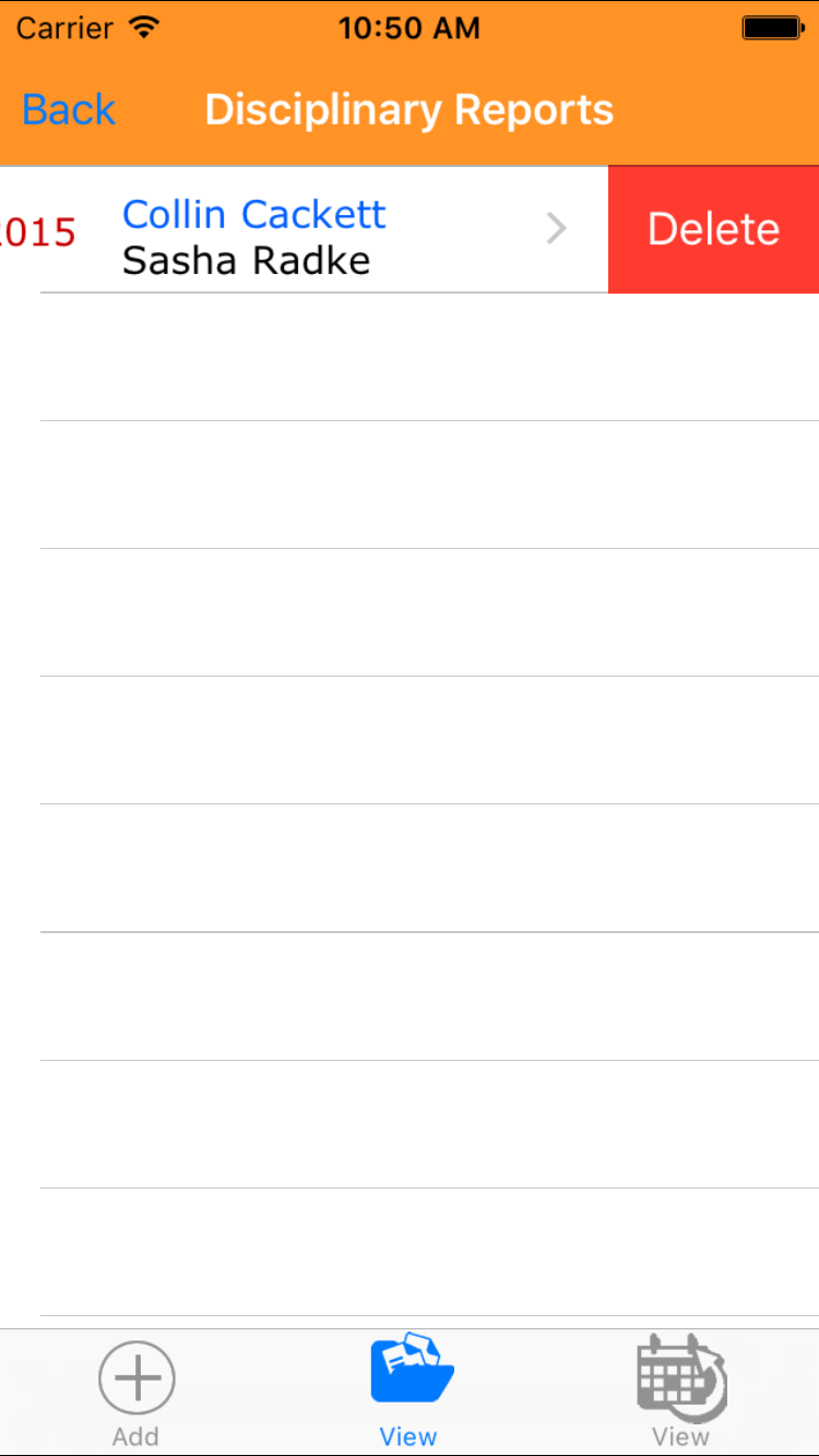 - Swipe from the right edge to the left to bring up the delete button for the disciplinary report.