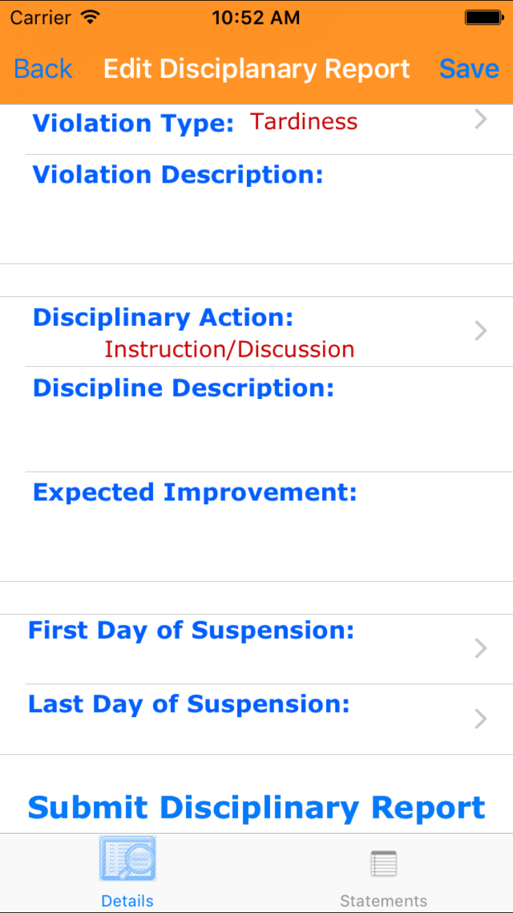 - Tap Save in the top right corner to save any changes to the Disciplinary Report.