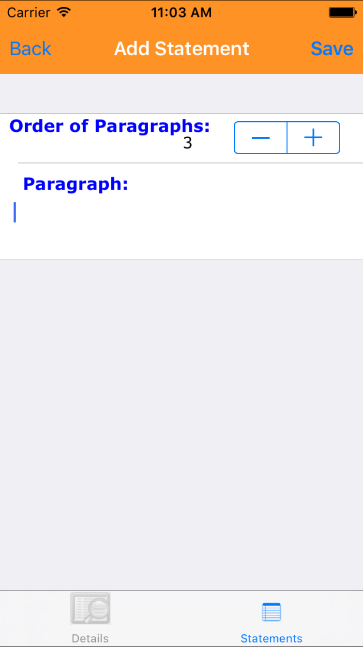 - Order of Paragraphs: The order of paragraph field allows user to tap the + sign on the stepper to increase or - sign on the stepper to decrease the value of the paragraph. Paragraphs of a