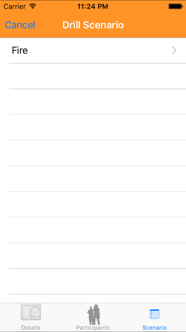 - Tap on the third tab, the Drill Scenario icon at the bottom of the screen to open the Drill Scenario screen. The screen loads with the list