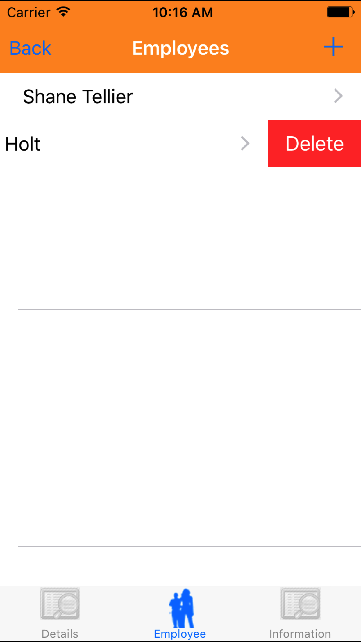 - Swipe from the right edge to the left to bring up the delete button for the employee.