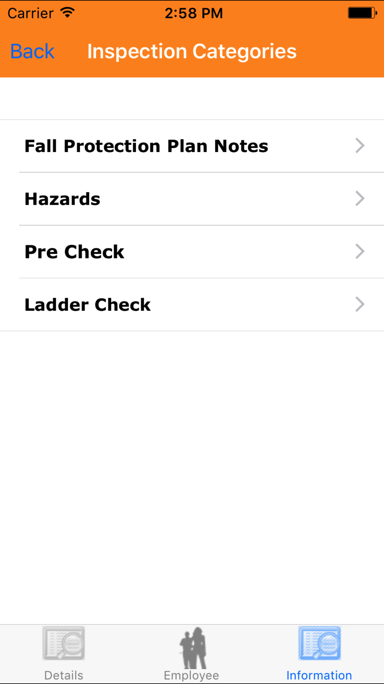 The pre work,ladder, and methods of restraint checklists are configured and maintained by company staff, to match up with companies safety concerns and field of work. The checklist categories include