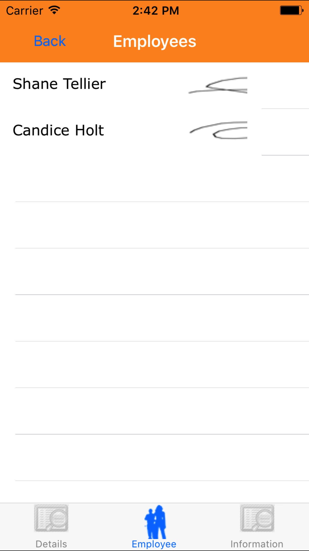 - Tap the second tab, the Employee’s tab of the History view. This loads with the employee’s names and their signatures