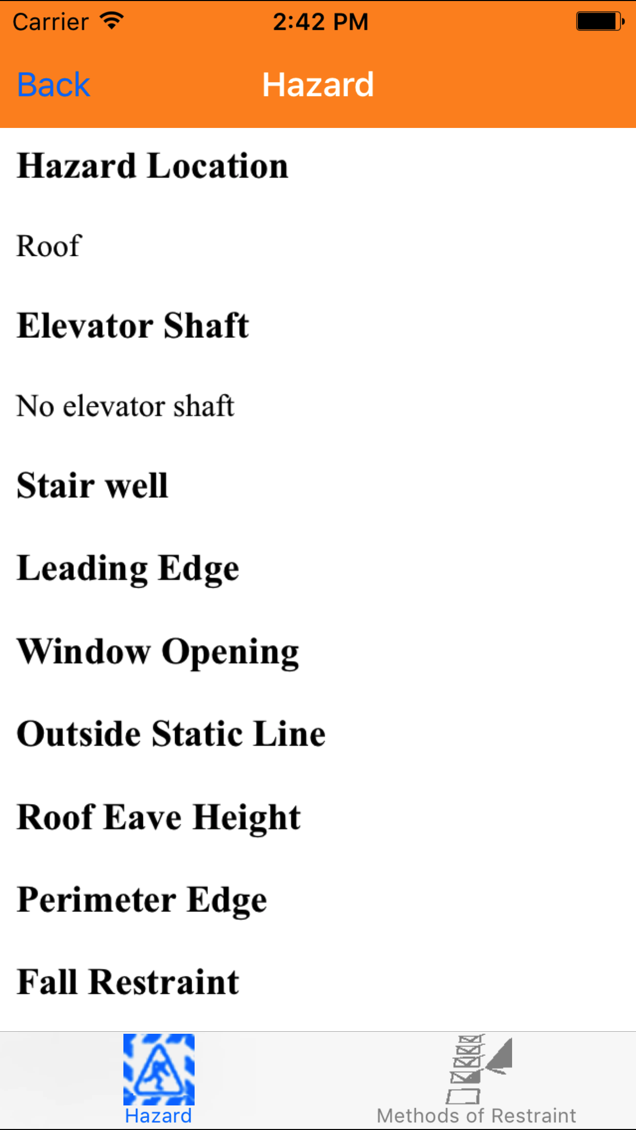 with the list of the 4 categories of the fall protection plan. Tap on each to view details on each section