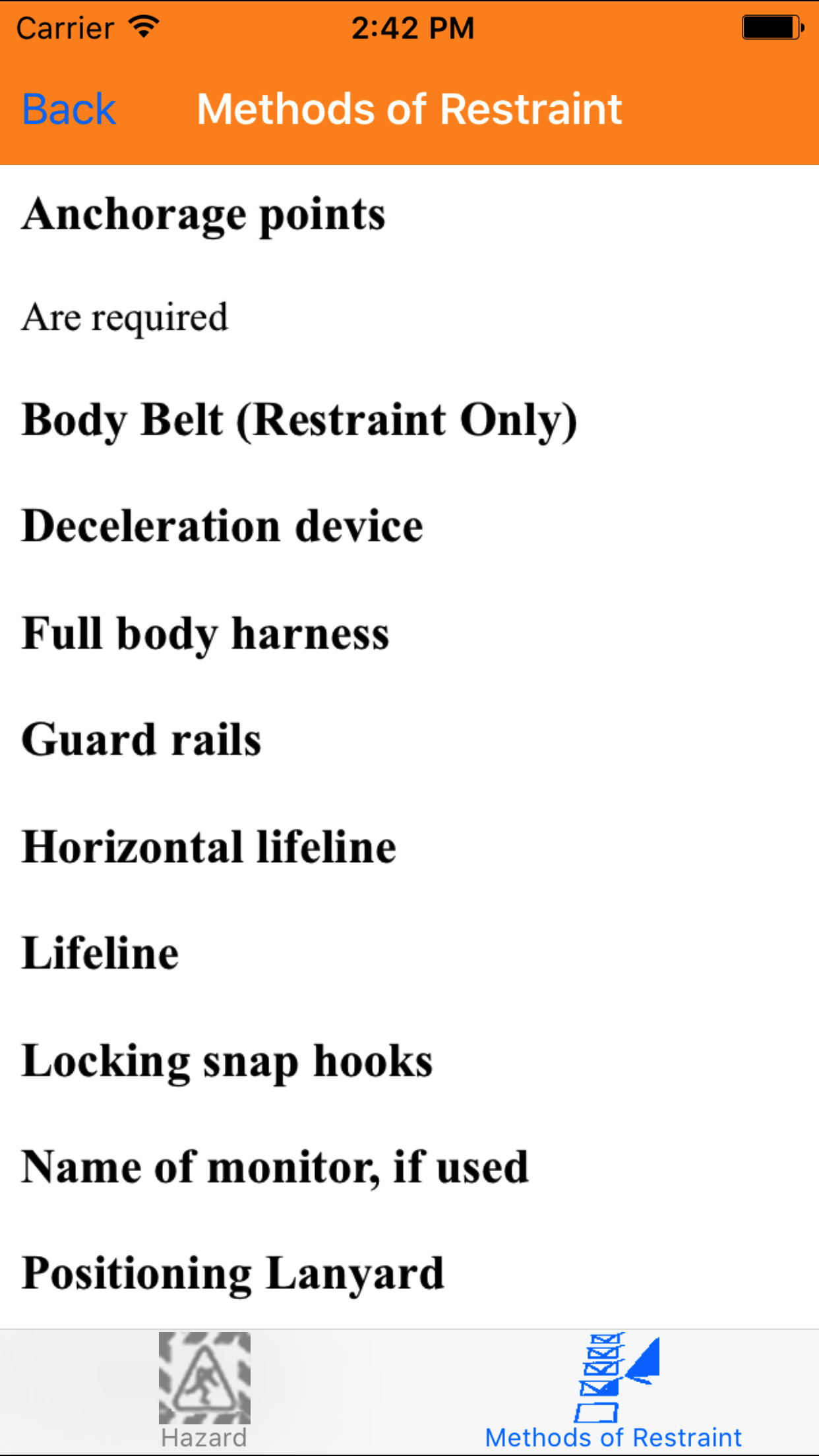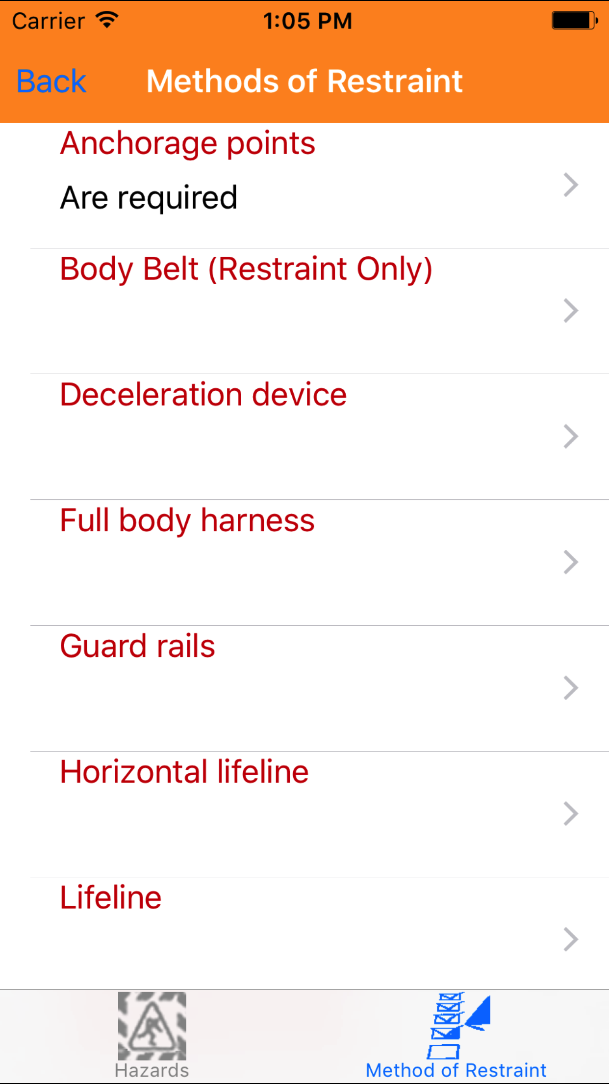 - Tap the Method of Restraint icon, the second tab. This opens the list of methods of restraint in red text, and comments in black text.