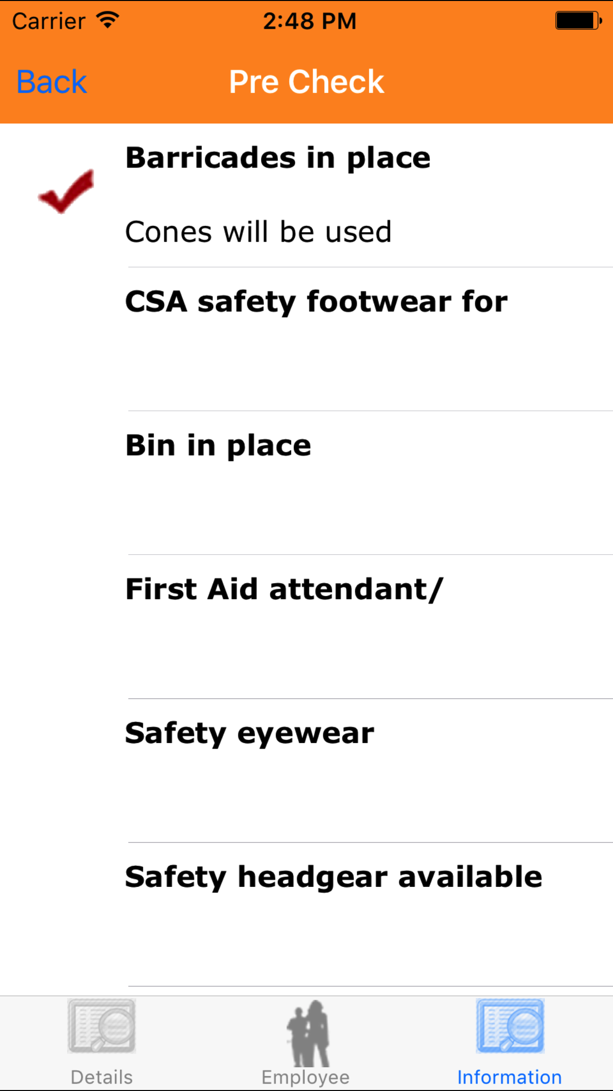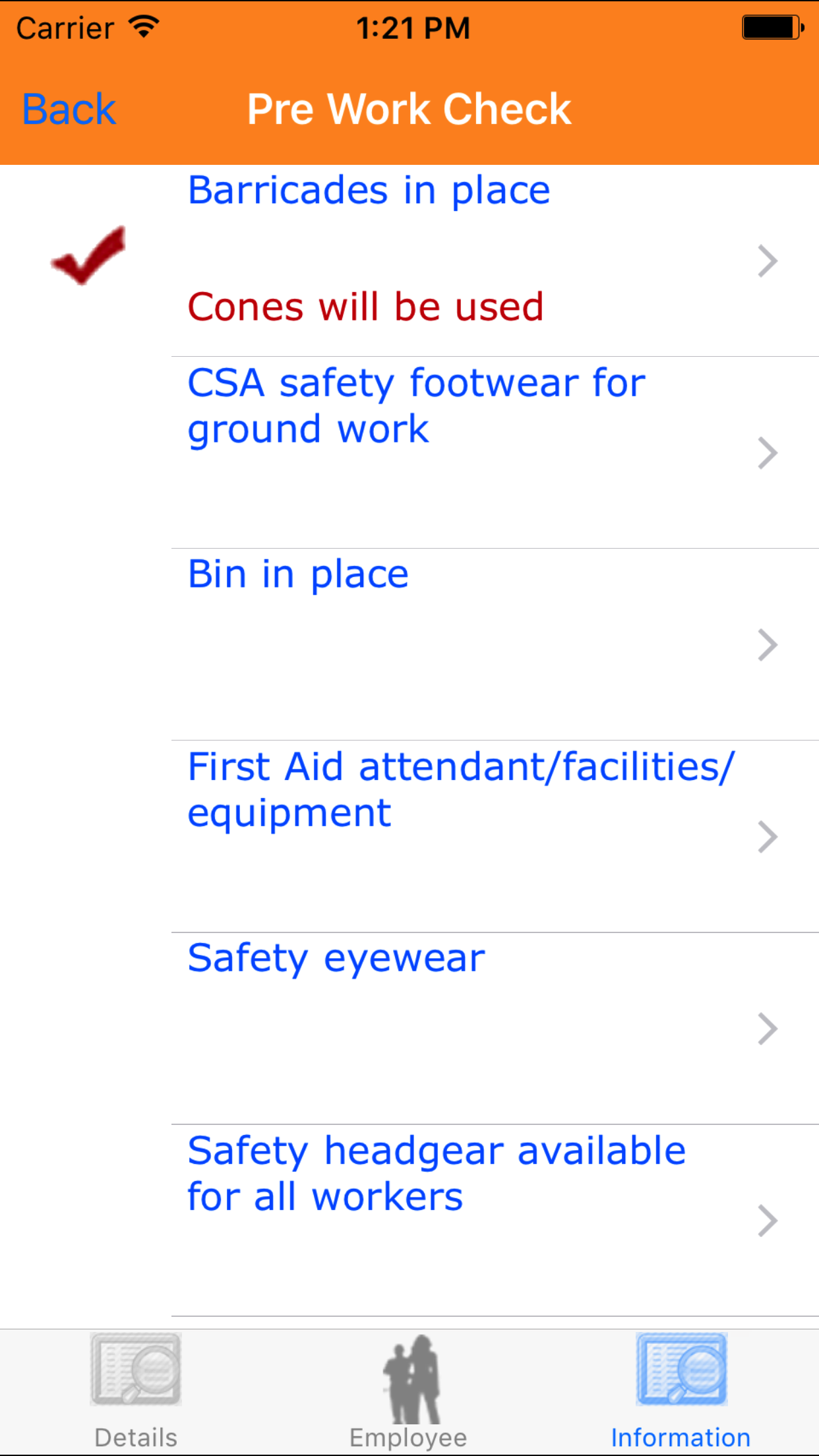 - Tap the Pre Work Check button which loads pre work check list.