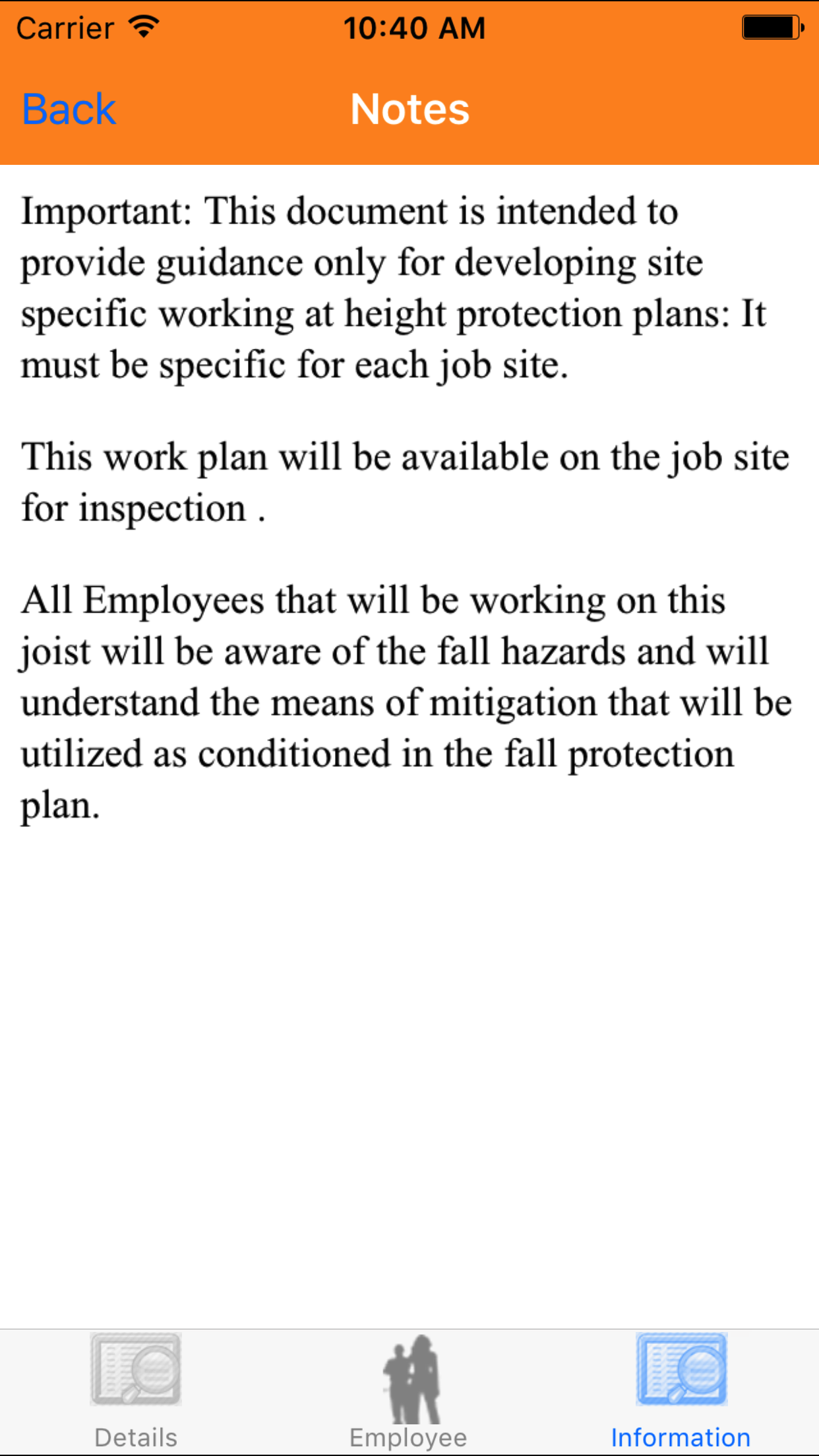- This opens the Fall Protection Plan Information screen. Tap the Next button in the top right corder
