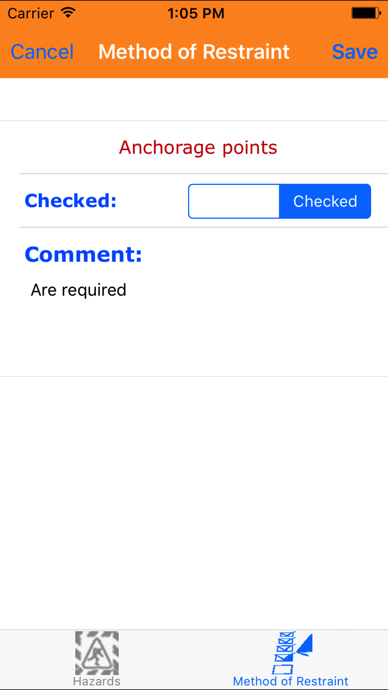 - Tap Checked on the __|Checked selector to indicate that work requires fall restraint equipment.