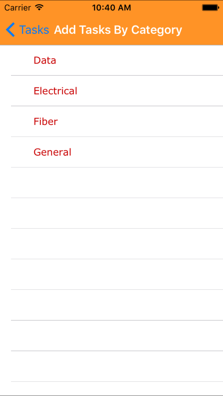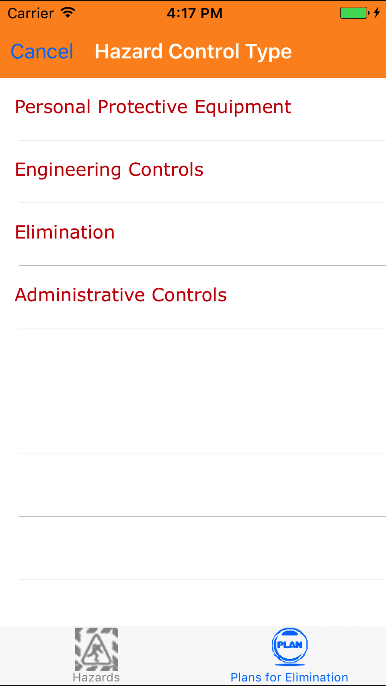 - Tap the desired hazard control type to select it or tap Back in the top left corner to leave the hazard control type field unchanged and return to the Add Plan for Elimination screen.