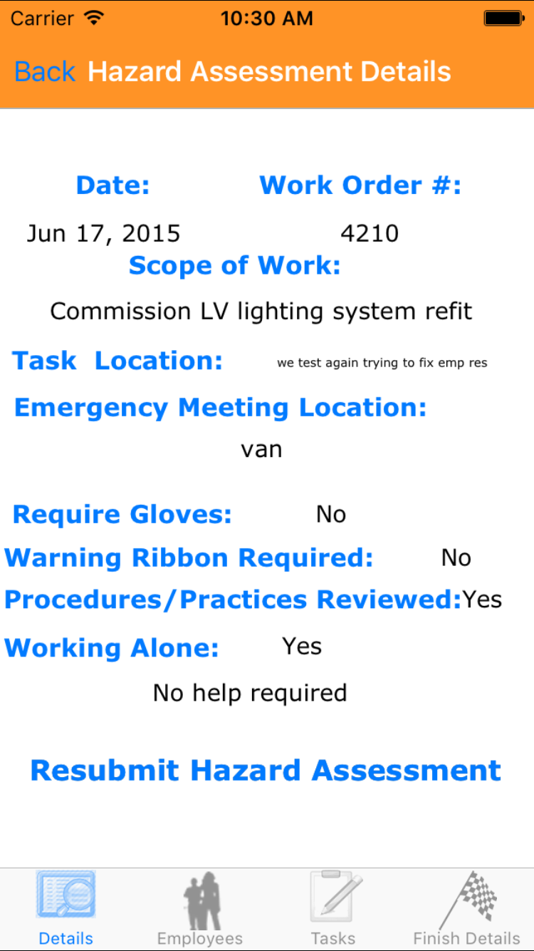 - Tap on the Hazard Assessment you would like to view. This loads the first tab, the Hazard Assessment details tab of the History view.